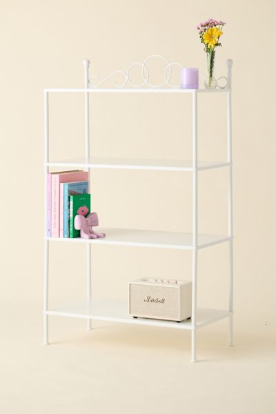 Bring a coquette feel to your living space and office with this iron bookshelf featuring four tall and spacious shelves that are perfect for displaying your novels, plants & tchotchkes. Complete with swirling motifs accenting the top shelf that adds a whimsical finishing touch to your storage shelf. Available exclusively at Urban Outfitters.
