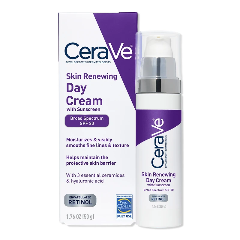 SKIN RENEW DAY CREAM SPF 30 1.7OZ. Benefits: Daytime face moisturizer with SPF improves the appearance of fine lines and skin texture with encapsulated retinol. Provides broad-spectrum sunscreen protection against UVA and UVB rays. Helps restore the protective skin barrier with three essential ceramides. Helps attract moisture to the skin with hyaluronic acid. Gentle, non-irritating formula. Hypoallergenic. Non-comedogenic. Developed with dermatologists. Key Ingredients: Encapsulated retinol helps smooth surface texture and improve the look of fine lines. Ceramides help restore and maintain the skin's natural barrier. Hyaluronic acid attracts hydration to the skin's surface and helps skin retain moisture. MVE Technology, a patented delivery system, continually releases moisturizing ingredients. Formulated Without: Fragrance.