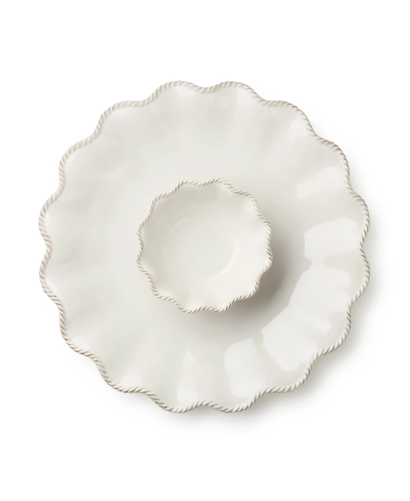 Serve your favorite snacks and dip in timeless style with the Heritage 2-Piece Chip and Dip Bowl Set. Whether you're hosting a weekend get-together or creating a showstopping holiday spread, this set makes every gathering feel more intentional and beautiful. The sculpted rope-like detailing along the rims adds a layer of sophistication and vintage charm, effortlessly blending with farmhouse, French country, or classic dining themes. Its warm ivory glaze adds softness to the tabletop, while the ripple-edge silhouette catches the eye from every angle.