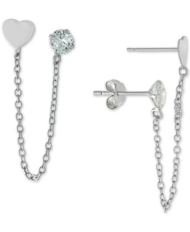 Chain-Connected Heart & Cubic Zirconia Double Stud Earrings in Sterling Silver