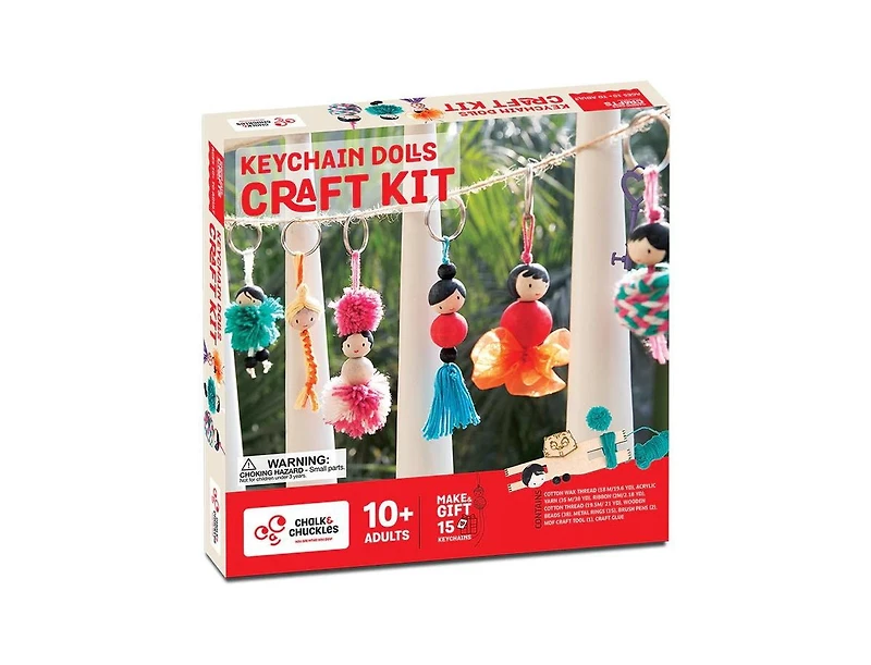 Get creative and craft 15 unique keychain dolls with the Chalk and Chuckles Keychain Dolls Craft Kit! This all-in-one Diy kit includes ribbons, wooden beads, cotton threads, and yarn to help kids create beautiful keychains using 5 different crafting techniques like pom-pom making, tassels, braiding, and beading.
