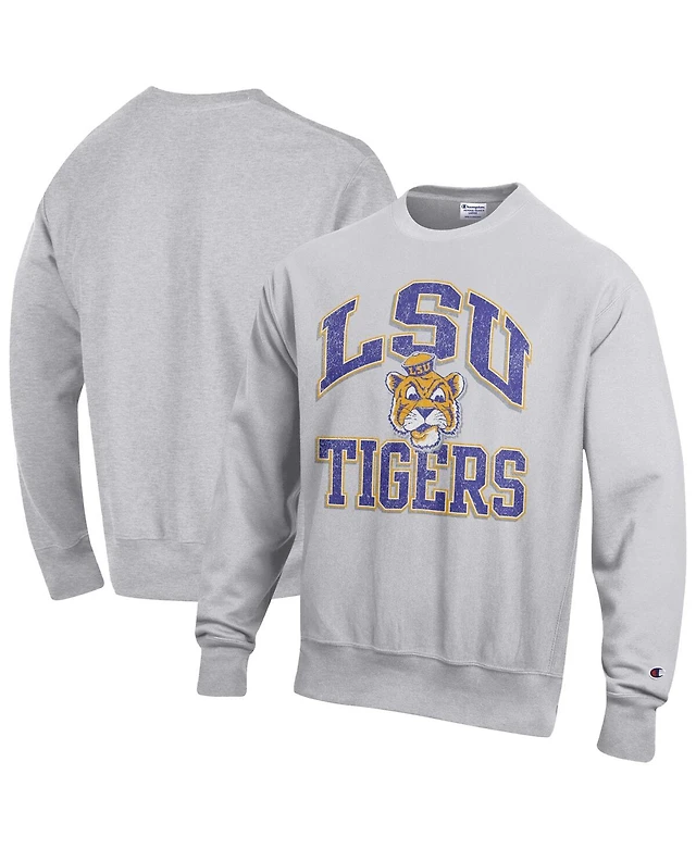 Champion Men's Gray Lsu Tigers Distressed Arch Over Logo Reverse Weave Crew Neck Sweatshirt