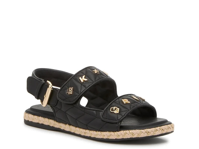 Add a charming touch to your summery style with the Charlay Studs sandal from Karl Lagerfeld Paris. The sleek silhouette features a classic double strap design, a quilted upper, and eye-catching goldtone accents decorated throughout. Complete with a braided espadrille midsole that adds a beachy flair.