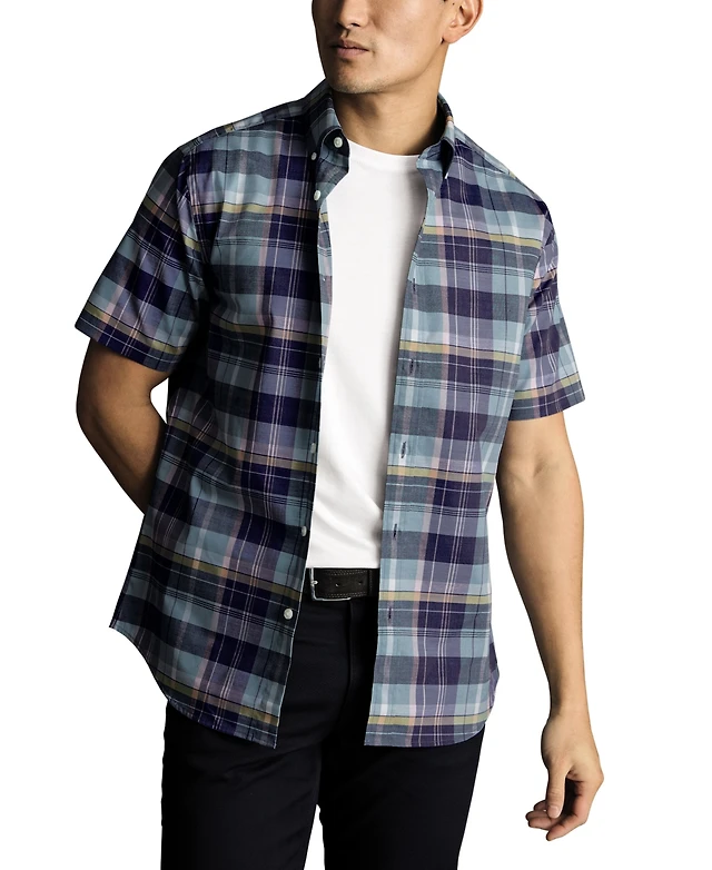 Charles Tyrwhitt Men's Slim Fit Short Sleeve Wrinkle-Resistant Plaid Button-Down Shirt