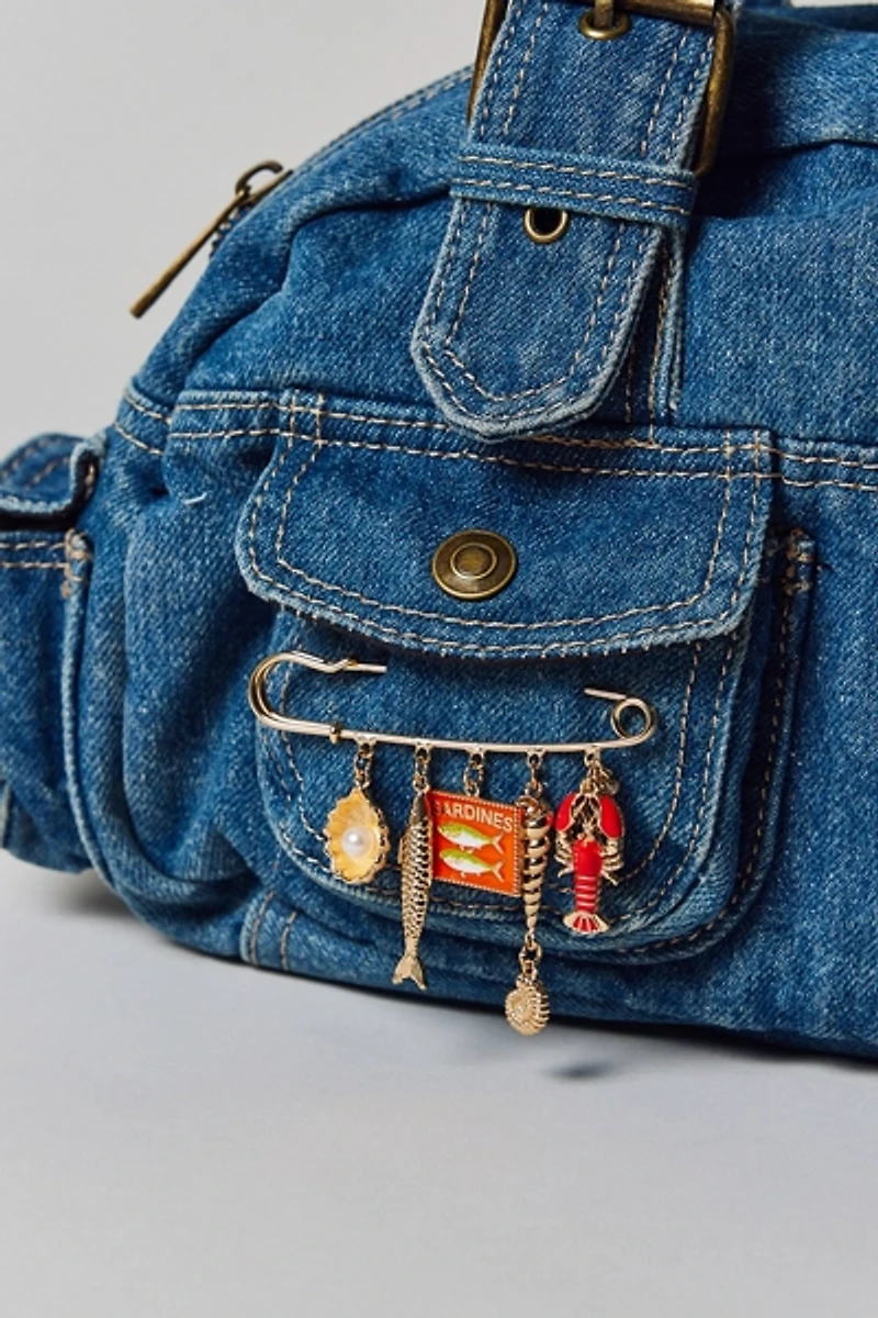 Add this oversized safety pin brooch to your look for an instant maximalist touch. Polished metal silhouette with a row of dangling charms. So versatile - pin it to your fave UO bag, BDG jeans and more!