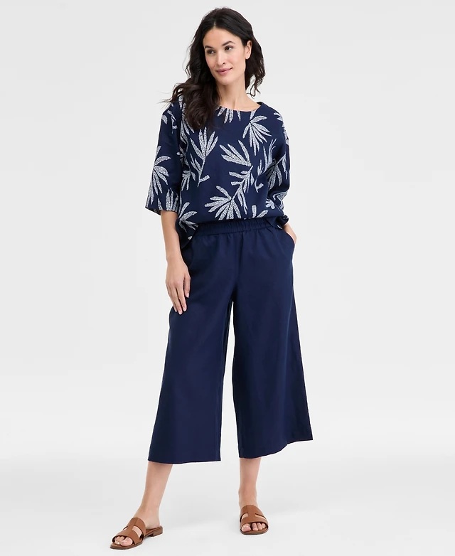 Charter Club Womens Cropped Wide Leg 100 Linen Pants Boatneck Palm Top Exclusively At Macys