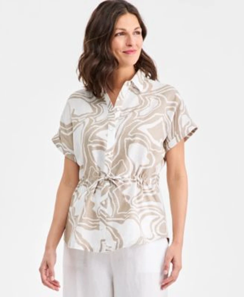 Finished in crisp, breathable linen, this subtly printed top by Charter Club features an adjustable drawstring at the waist so you can style this sleek look your way.