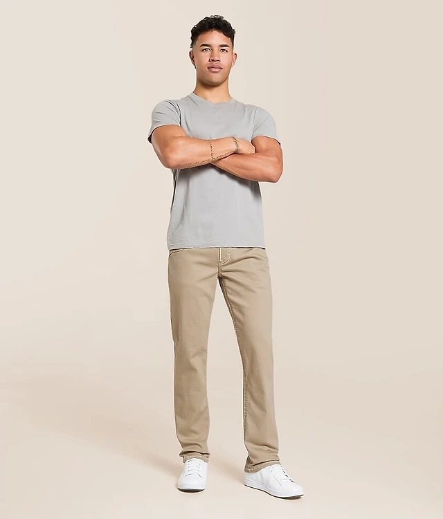 Regular fit pant Straight from knee to hem Low rise, 16 1/2" bottom opening Embroidered faux flap back pockets Zip fly