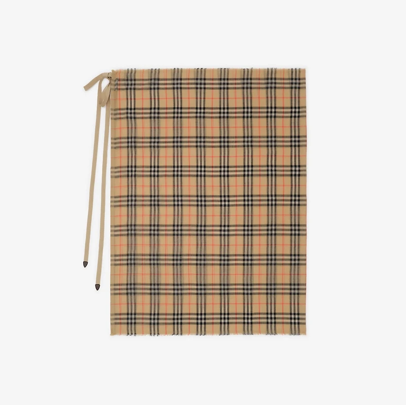 A lightweight cotton sarong, woven with the Burberry Check in signature sand beige. The design is secured with tonal ties featuring shield-shaped leather tabs – a nod to our Equestrian Knight Design. Rectangular Eyelash fringing at the edges