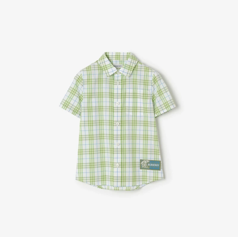 A short-sleeved cotton shirt, woven with the Burberry Check in summery apple green. The design features appliquéd labels depicting our logo and beach scenes – a playful nod to summer holidays on the British seaside. Button closure Point collar Chest patch pocket Curved hem