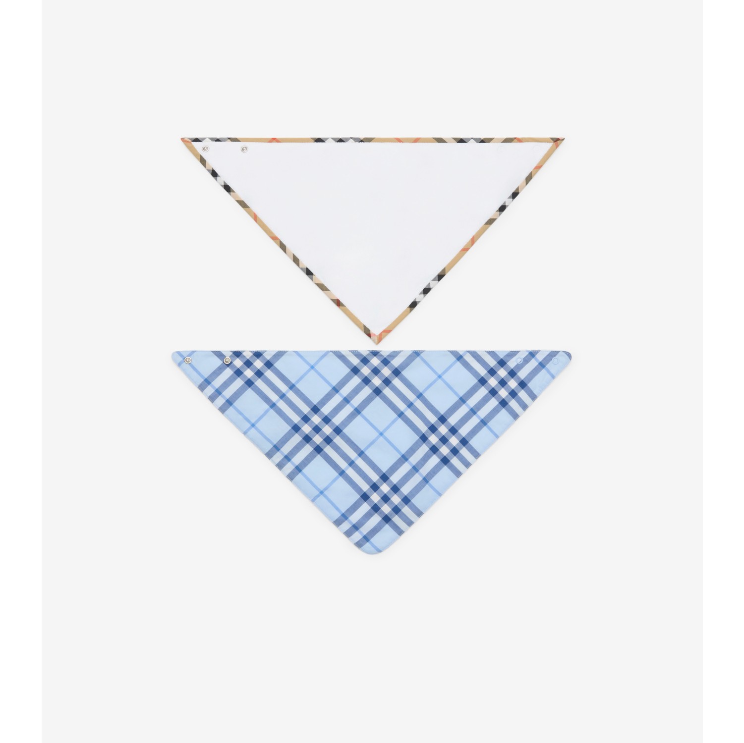 A set of two bandana bibs made from soft cotton and towelling. The Burberry Check is woven either as a trim in signature sand beige or on the reverse in a seasonal ice blue colourway. Press-stud closure Presented in a Burberry gift box