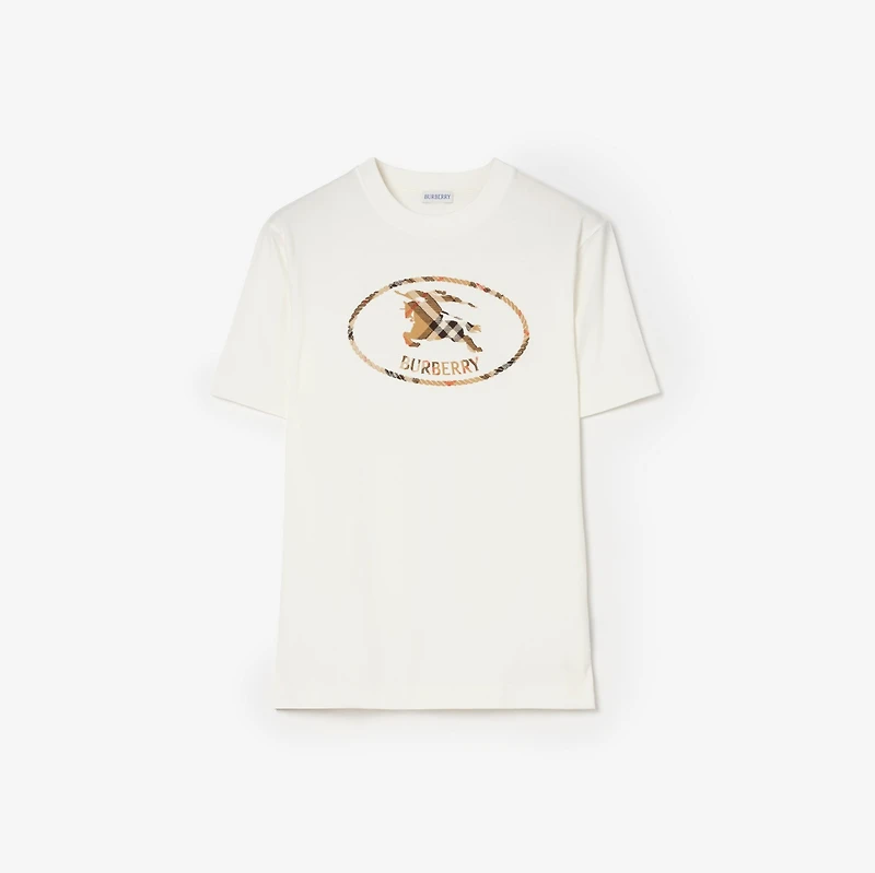 A T-shirt in lightweight cotton jersey, cut to a slim fit. The style is embroidered with our Knight stamp in sand beige Burberry Check – the archival motif was first seen on Burberry bags in the 1980s. Rib-knit neckline Embroidered Equestrian Knight Design at front