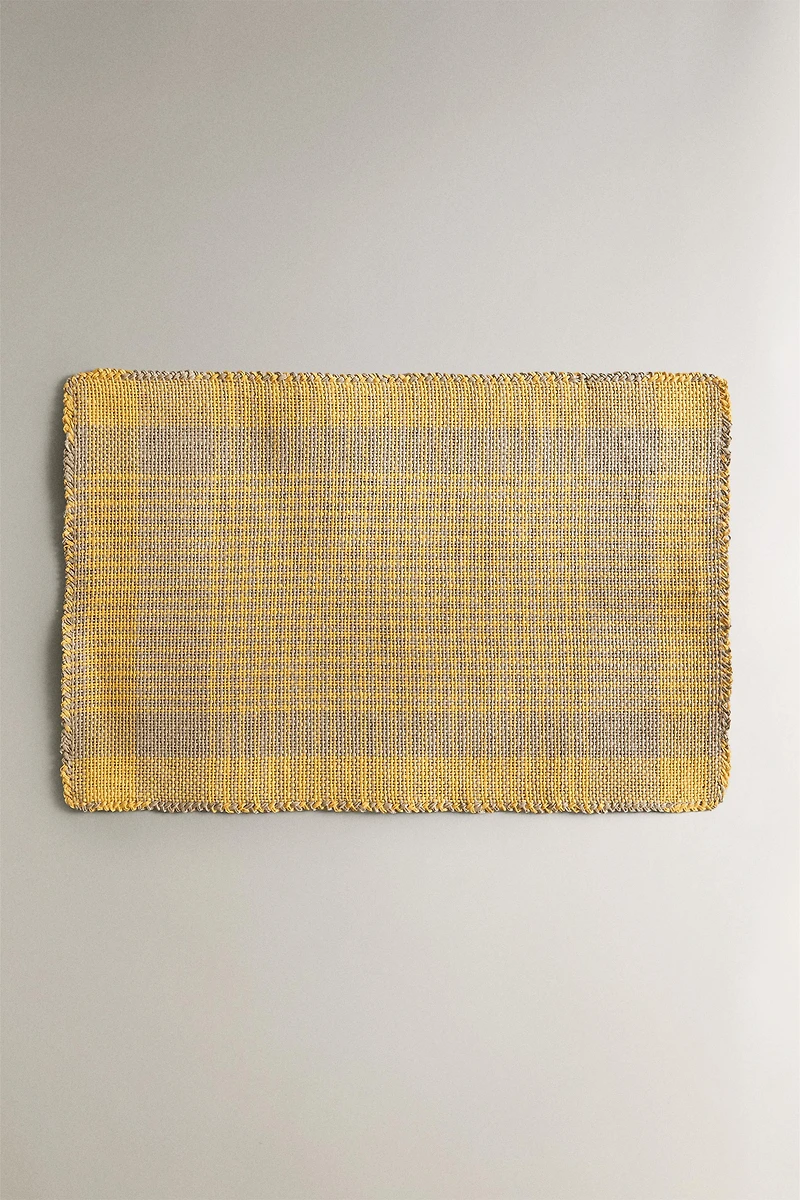 Woven paper placemat with a check design.