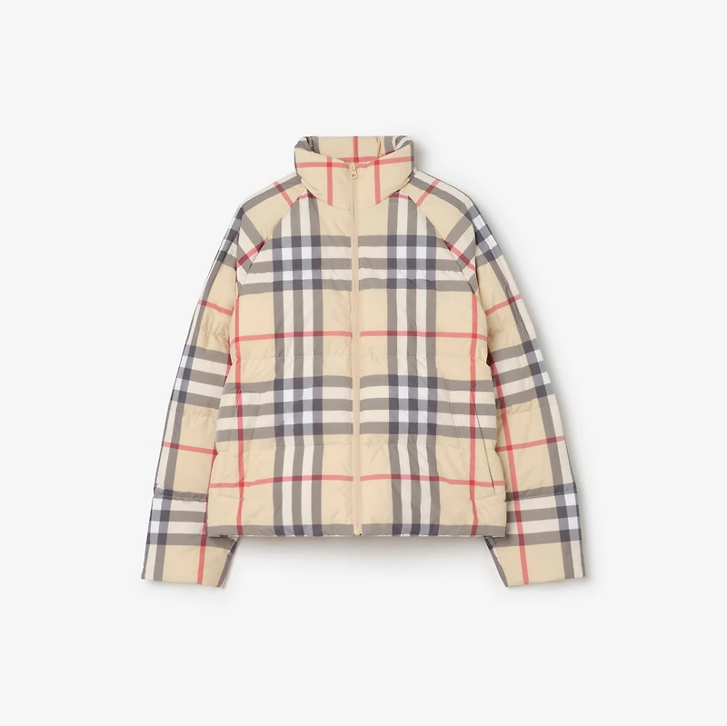 A puffer jacket filled with duck down and feathers, woven with the Burberry Check in our pale stone colourway. Zip closure Side press-stud welt pockets Length: 60cm/23.6in (size UK S) Outer: 100% polyester Lining: 100% polyester Filling: 90% duck down, 10% duck feathers Wadding: 100% polyester fibres Machine wash Imported