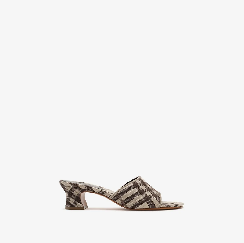A pair of Sloane mules set on a block heel, made in Italy from a cotton blend woven with a textured Burberry Check in light beige. The insole is quilted for comfort and the leather sole is embossed with our Equestrian Knight Design. Almond-shaped toe Quilted insole Equestrian Knight Design at sole Comes with a dust bag