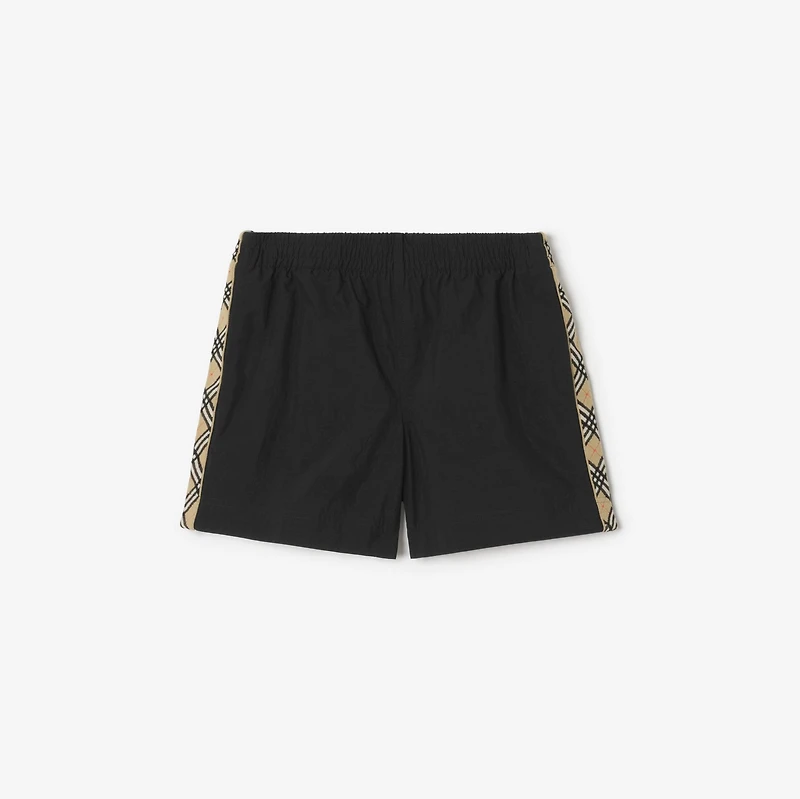 A pair of swim shorts made from lightweight nylon with a partial mesh lining. The design is framed with Burberry Check taping in signature archive beige. Elasticated waist Side slip pockets, back patch pocket