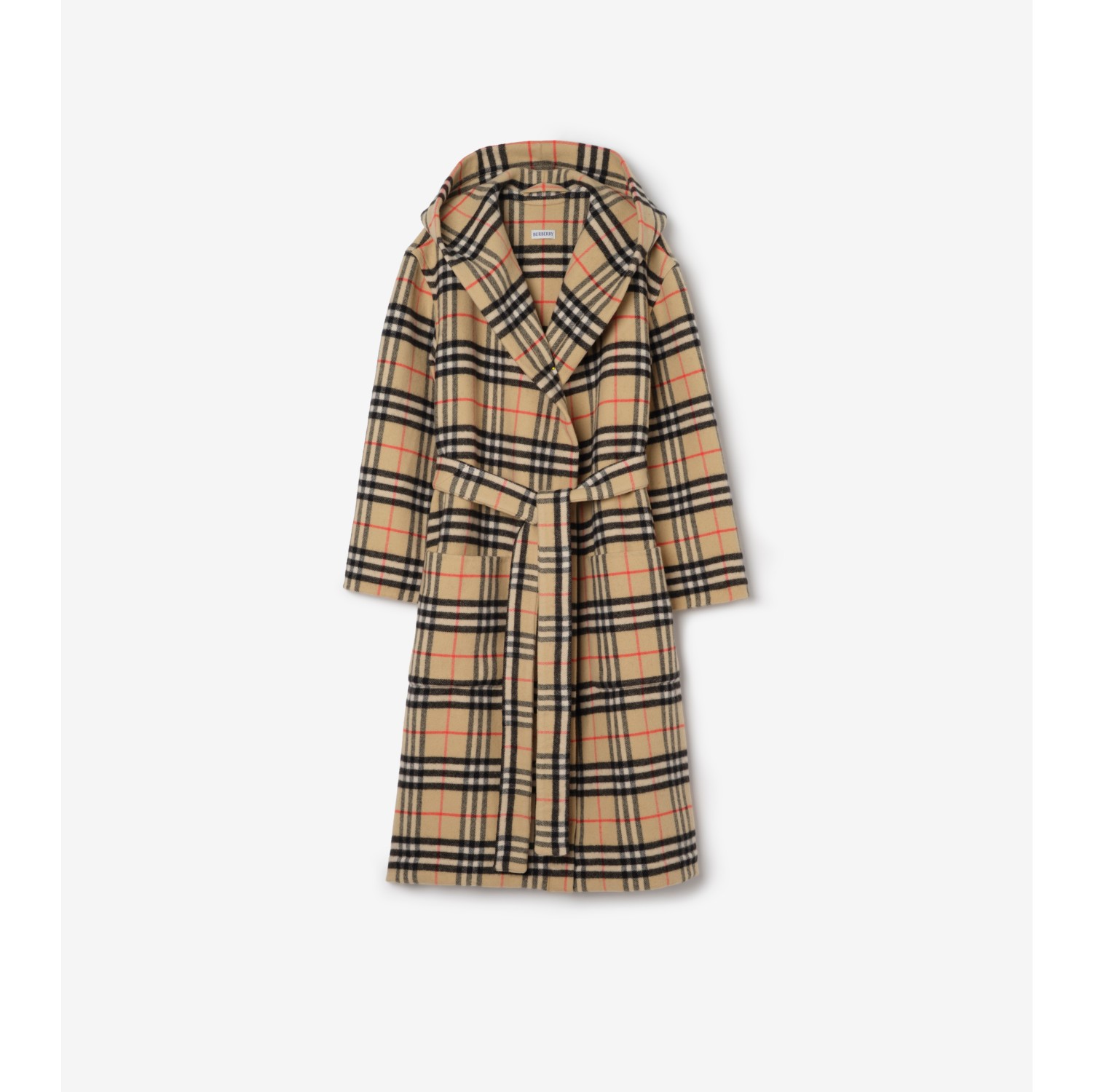 A hooded robe made in Scotland from a cosy blend of wool and cashmere. The design is woven with the Burberry Check in our signature sand beige colourway. Self-tie belt Side patch pockets