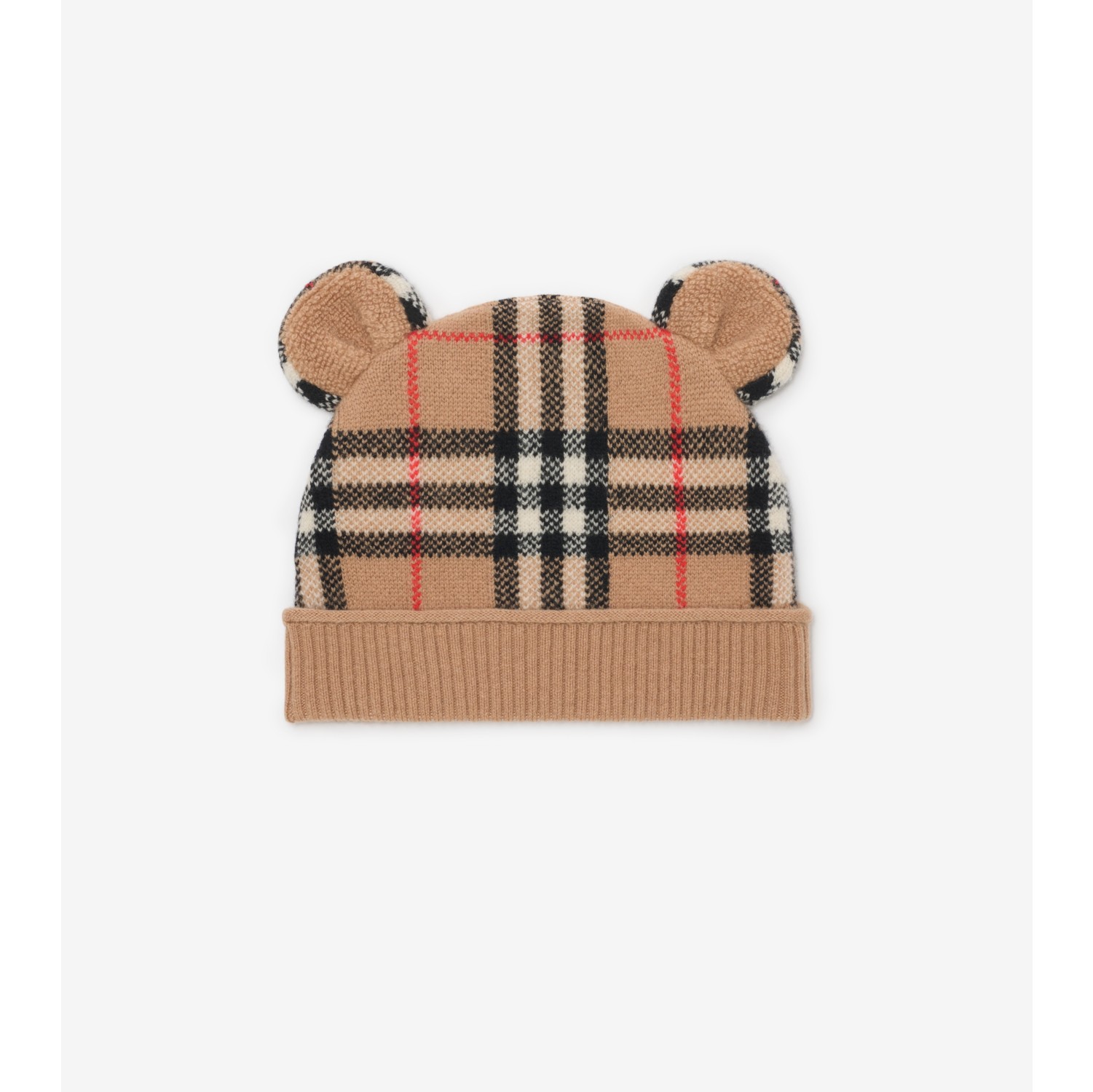 A Burberry Check beanie knitted from soft wool cashmere in our signature sand beige colourway. The design is topped with playful ears in a nod to our much-loved mascot, Thomas Bear. Rib-knit brim
