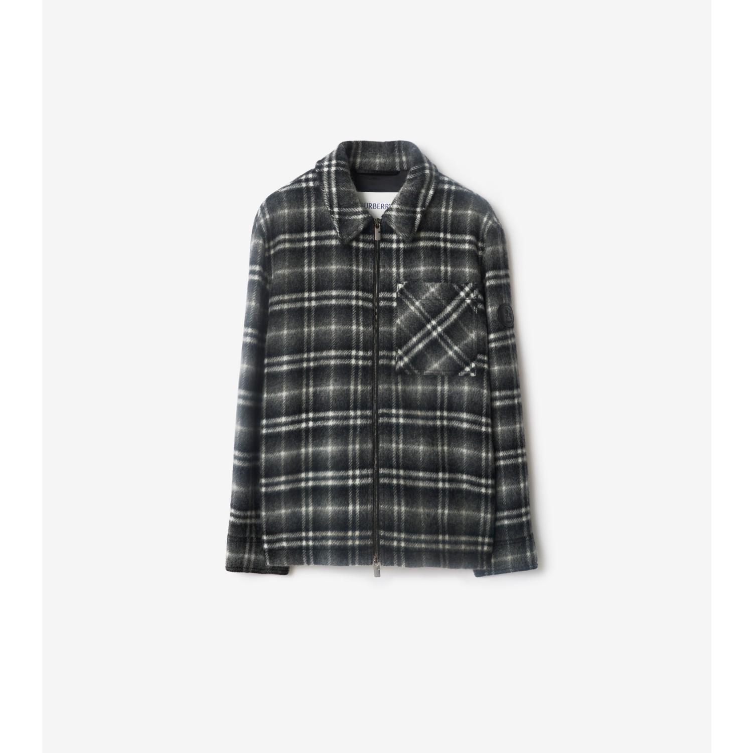 A zip-front overshirt made from brushed wool twill, woven with the Burberry Check in a monochrome palette. Cut to a regular fit, the design is appliquéd with a leather Knight stamp – an archival motif first seen on Burberry bags in the 1980s. Two-way zip closure Point collar Chest patch pocket Single press-stud cuffs Straight hem Leather patch with Equestrian Knight Design at sleeve