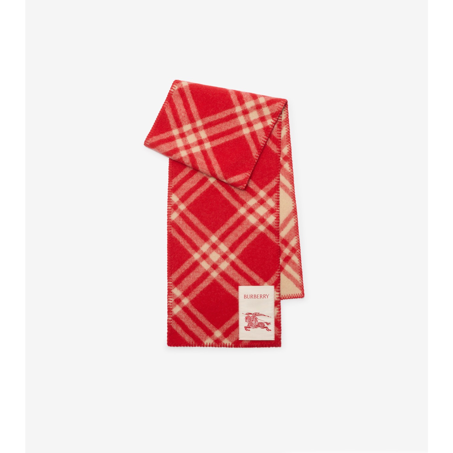 A wool scarf, woven in Norway with a seasonal crayon red check – created as part of our Year of the Horse capsule. The design features blanket stitching and is brushed for a soft finish. Rectangular Blanket stitching at edges Equestrian Knight Design label
