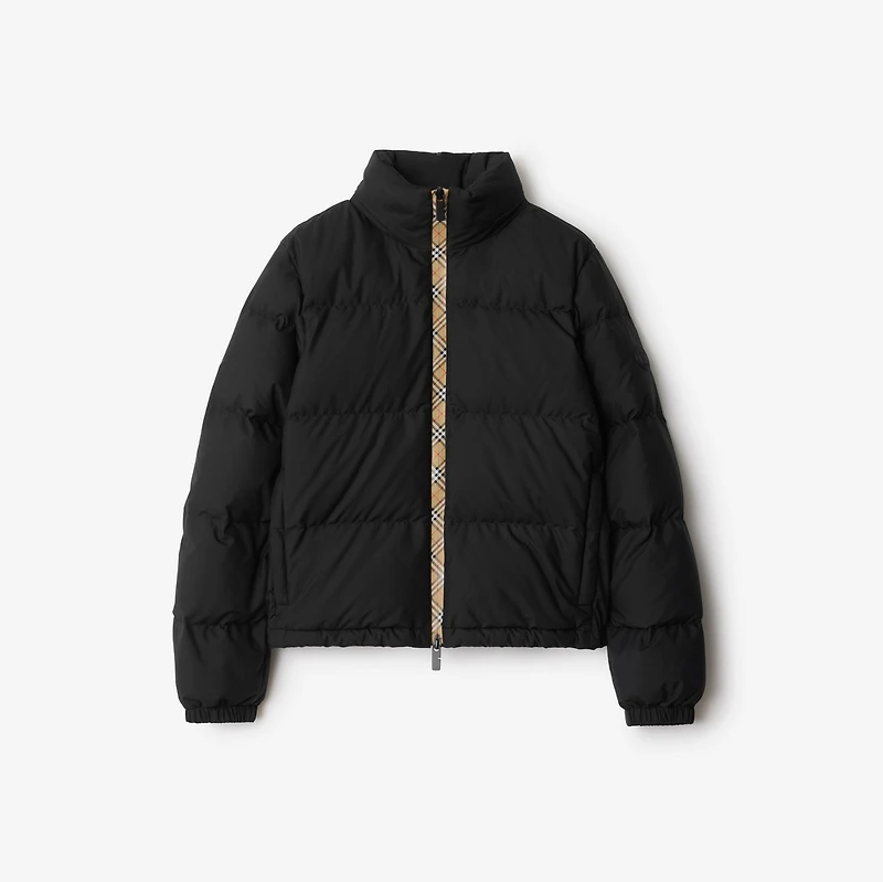 A puffer jacket with Burberry Check taping at the front zip and a packaway hood in our signature sand beige colourway. The Ambleside is cut to a regular fit and appliquéd with our Knight stamp, an archival motif from the 1980s. Two-way zip closure Packaway drawcord hood Side zip pockets Elasticated cuffs Drawcord hem Silicone patch with Equestrian Knight Design at sleeve Comes with a garment bag