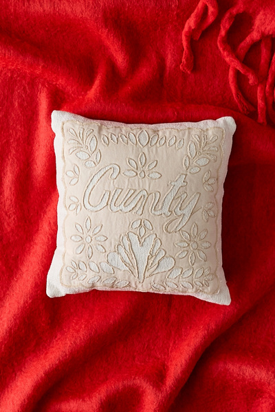 Not your grandma’s doily doily-inspired throw pillow. Inspired by ornamental lace mats, this decorative pillow features a slogan cutout applique layered over a textural cotton base. Available exclusively at Urban Outfitters.