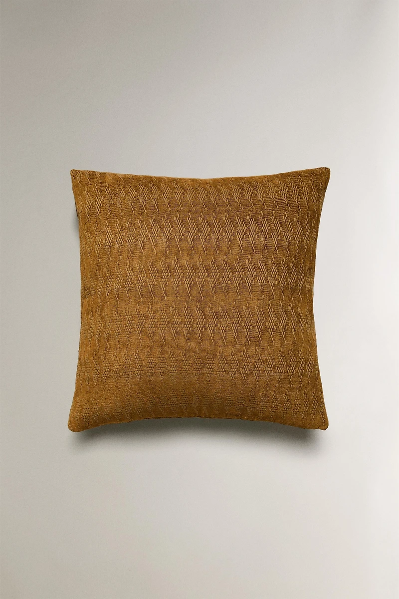 Chenille cushion cover with a geometric jacquard design.