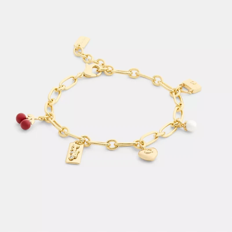 This chain link charm bracelet features some of our most iconic motifs including our Horse and Carriage hangtag, Signature heart, cheerful cherries, a quilted Tabby bag and an elegant pearl. Finished with a Signature toggle closure, it adds Coach style to any look.