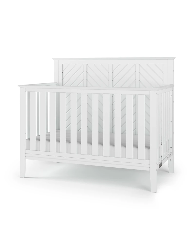 The Child Craft Atwood 4-in-1 convertible crib boasts angled geometry with a chevron patterned headboard, providing modern style while the beveled edges gives a traditional appearance. The rich finish ties the unique and intricate details together. The high quality construction will see your child through the years as the crib converts to a toddler bed, day bed, and full size bed (toddler guard rail and full size bed rails sold separately). A strong metal mattress support adjusts to 3 heights to accommodate your little one as they grow. Available in Child Craft's signature Cocoa Bean, Lunar Gray, and Matte White baby-safe finishes, the Atwood crib creates a bedroom for your child that is just as unique as they are.