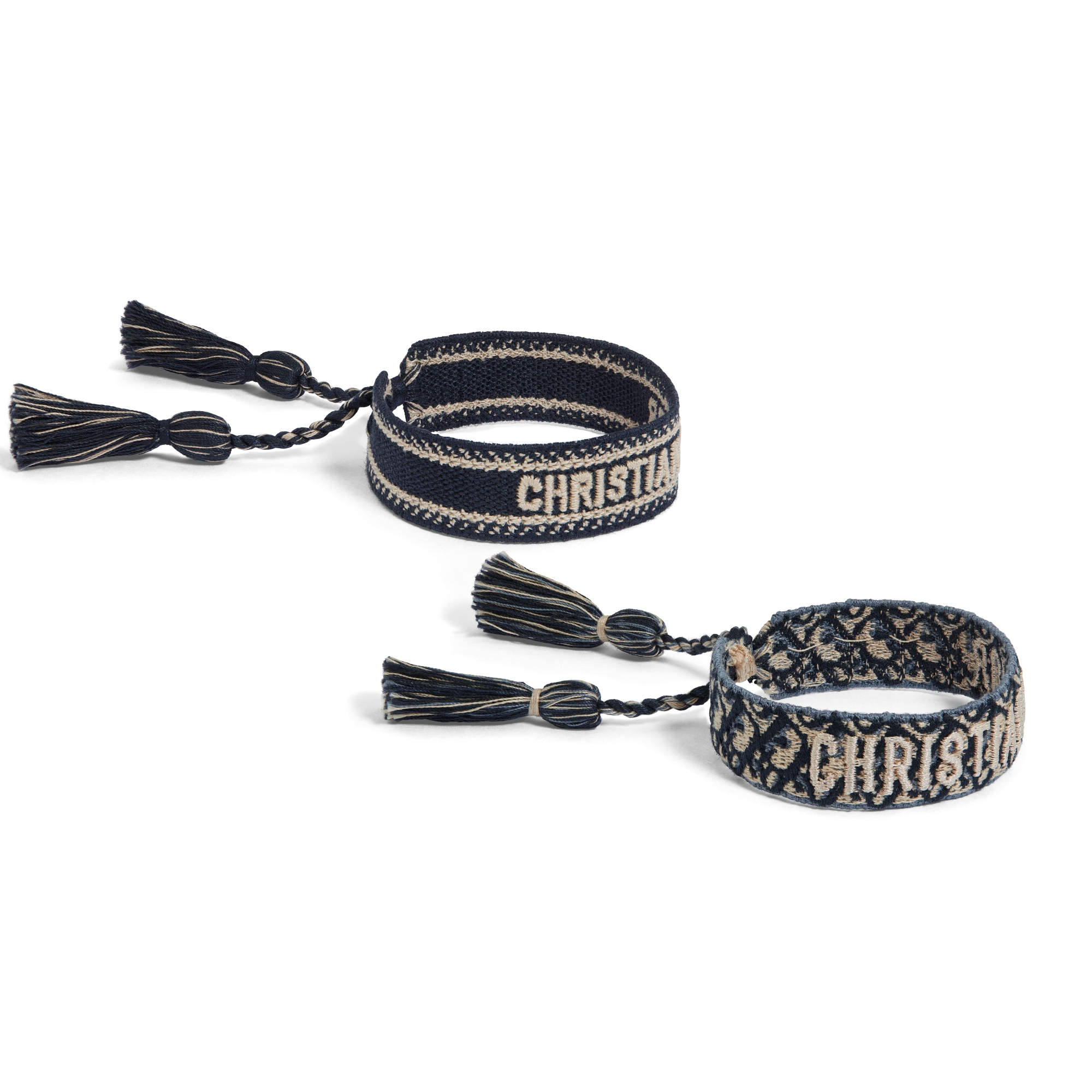 The Christian Dior bracelets are available in a new combination of colors. The Christian Dior signature adorns gray cotton, paying tribute to the iconic Dior Oblique motif. The bracelets are adjustable with handmade tassel cords, and can be worn for any occasion, alone or stacked.
