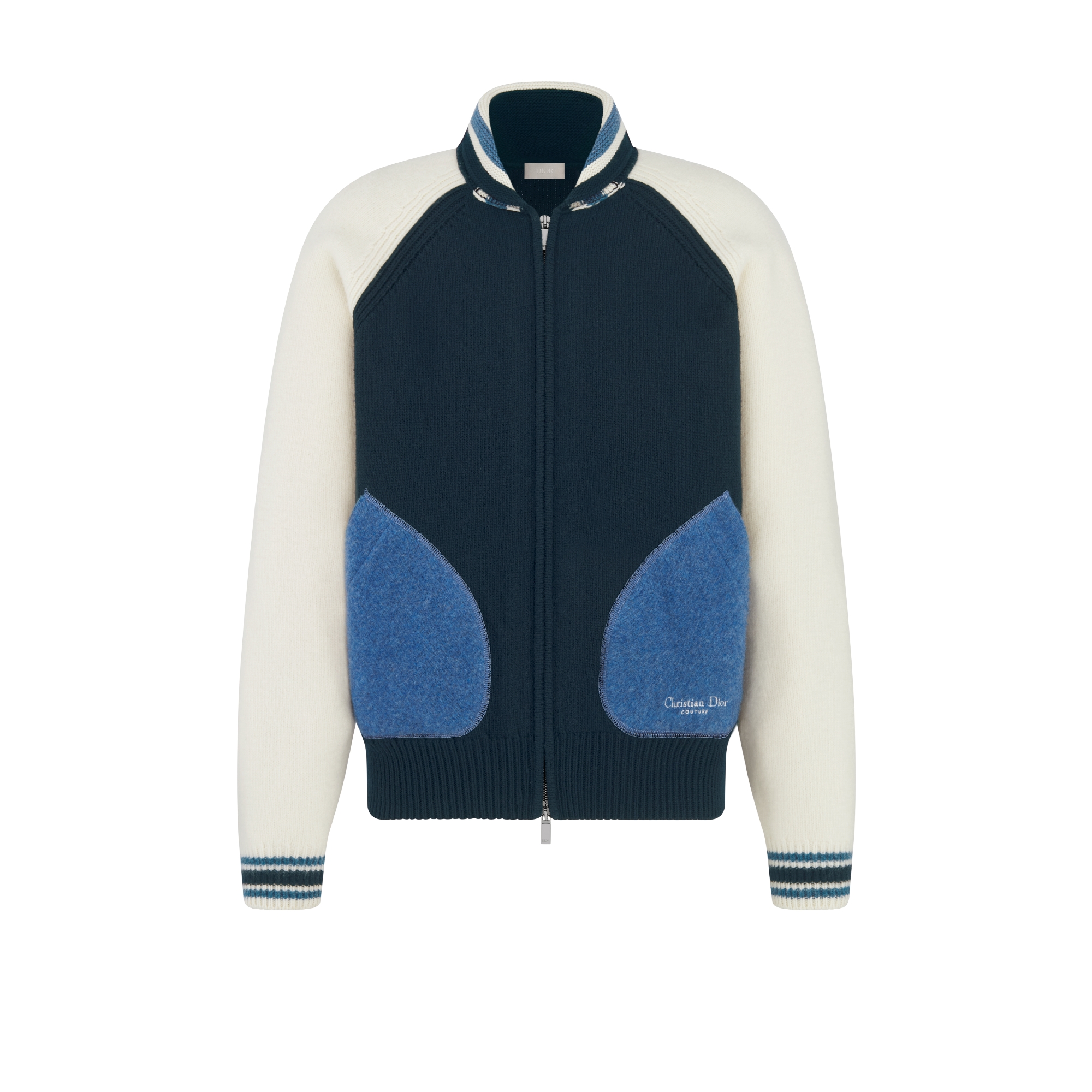 New for Fall 2025, the Christian Dior Couture Lily of the Valley two-tone varsity cardigan reimagines the university style in a color-block variation. Crafted in blue and beige felted wool jersey, it plays on contrasts with contrasting pockets and sleeves. The Christian Dior Couture embroidery is embellished with beads and a lily of the valley flower, in homage to Mr. Dior's passion for flowers. The cardigan will coordinate well with any other designs in the collection. Christian Dior Couture Lily of the Valley embroidery with beads on the back. Christian Dior Couture signature on the front. Ribbed collar, hem and cuffs. Patch pockets. Two-way zip fastening with Dior zipper pulls. 100% wool (5 gauge)*. Made in Italy