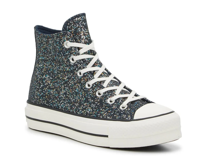 Casual looks get a trendy update with the Chuck Taylor All Star platform sneaker from Converse. This high-top features a classic black hue, decorated with multicolor confetti for a playful pop. Complete with a platform design that lifts the sporty style.