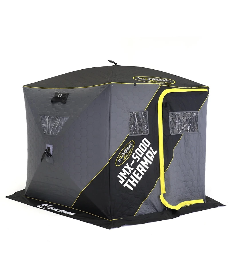 Stay warm and comfortable on your next ice fishing trip with the Clam Jason Mitchell X5000 Thermal Hub Shelter! With 62 sq. ft. of space, it fits 4-6 anglers. Its 900-denier fabric and full thermal skin retain heat and reduce condensation. The oversized skirt allows for ample snow banking, and you can add an X5000 removable floor (sold separately) for extra coverage. Ice anchor straps ensure stability in windy conditions. Portable and easy to pack, it folds down to 63"" x 12"" x 12"". Elevate your ice fishing experience with the Jason Mitchell X5000 from Clam!