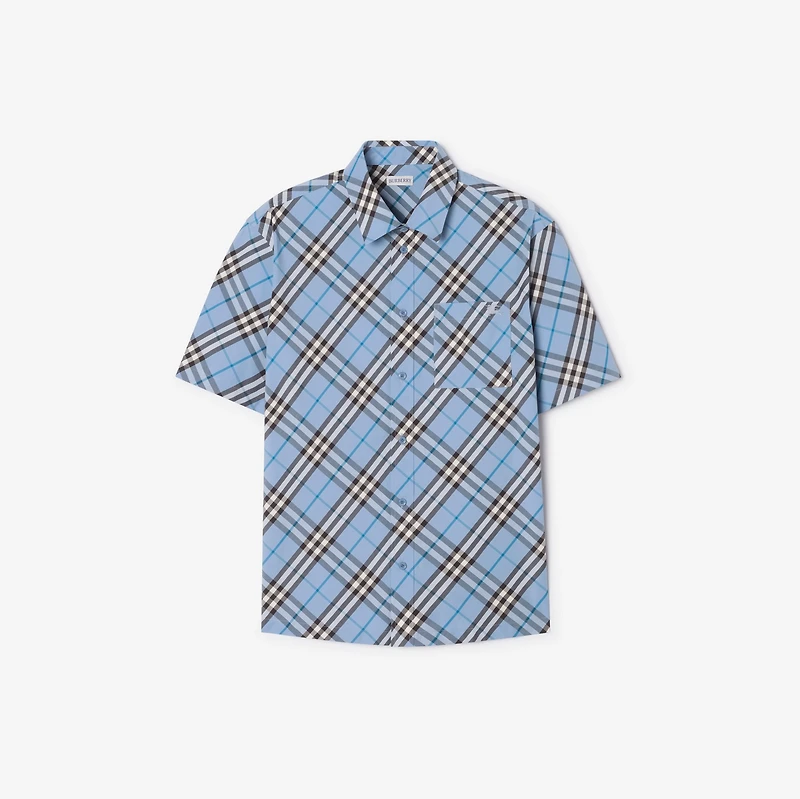 A short-sleeved cotton shirt, woven with the Burberry Check in seasonal cornflower blue. The design is cut to a classic fit and features our embroidered Equestrian Knight Design at the pocket.