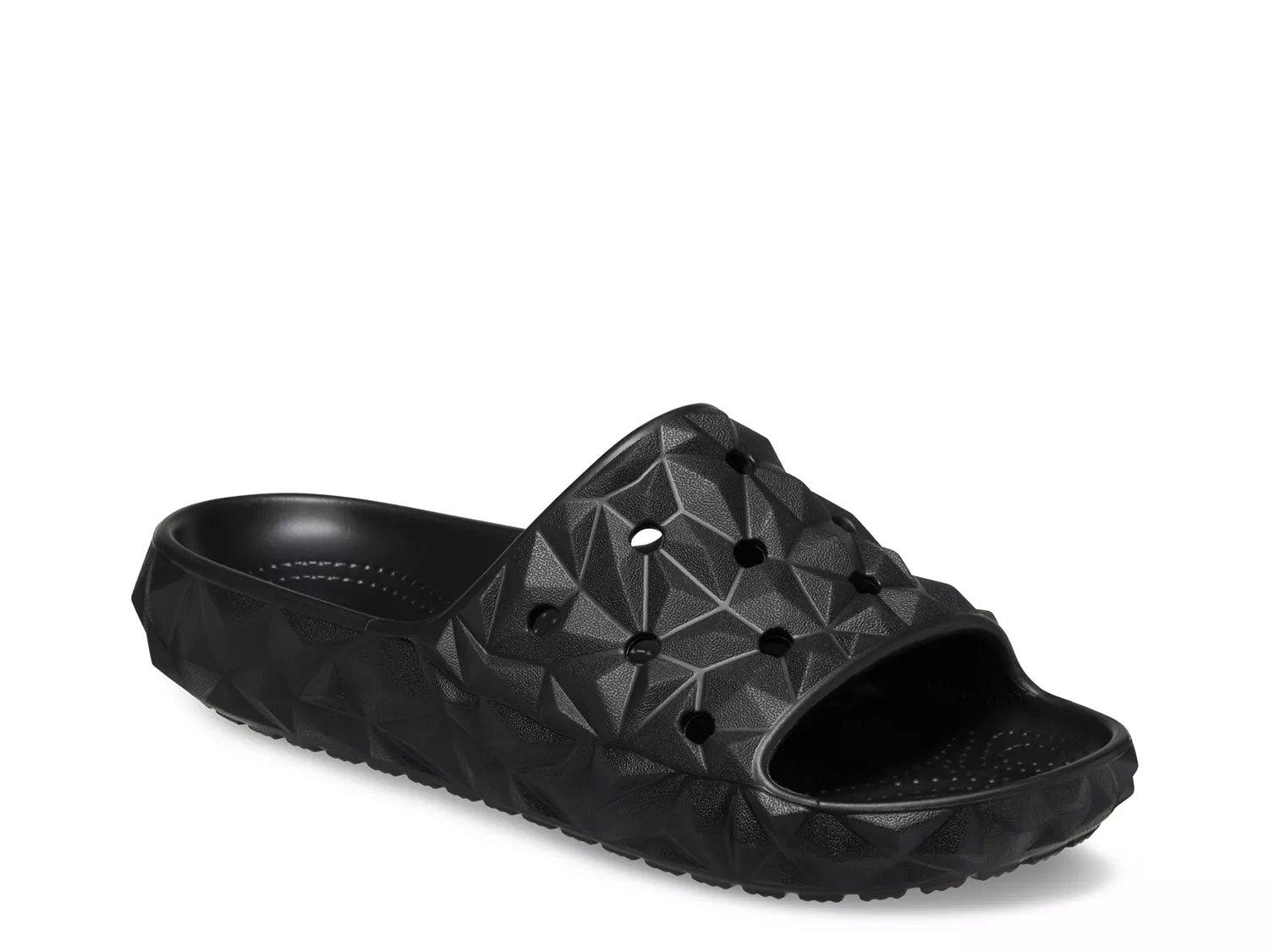 Discover the perfect balance of comfort and fashion with the Classic Geometric slide sandal from Crocs. This vegan sandal is enhanced with deep cupped Croslite foam footbed and Iconic Crocs Comfort to guarantee flexibility and 360-degree comfort. Its unique geometric molded design allows customization with Jibbitz charms for added appeal.