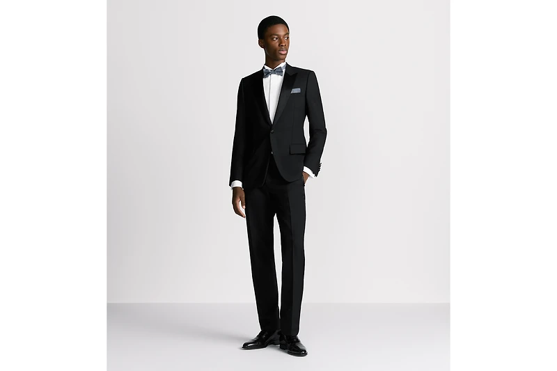 Tailoring is quintessential Dior atelier savoir-faire and lies at the heart of House heritage. Celebrating this unique expertise, the codes of elegance are reimagined in an iconic Dior silhouette: the tuxedo. Crafted in black virgin wool grain de poudre with traditional interfacing, the tuxedo can be worn in any season. The single-breasted jacket is characterized by satin on the lapels and buttons. It has a classic fit with elegant draping, while the regular-fit, mid-rise pants are enhanced by satin inserts on the sides. The tuxedo can be completed by a shirt and bow tie for a more elegant look on any special occasion. Jacket:. Satin peak lapels. Traditional interfacing. Handstitched details. Single-breasted with one button and functional buttonhole. Satin-covered buttons. Chest pocket and side flap pockets. Four interior pockets including one with a button. CD jacquard body and sleeve lining. Rear vent. Made in Italy. Pants:. Zip and hook closure. Side pockets and one rear pocket. 100% virgin wool and lining: 100% cupro. Made in Italy