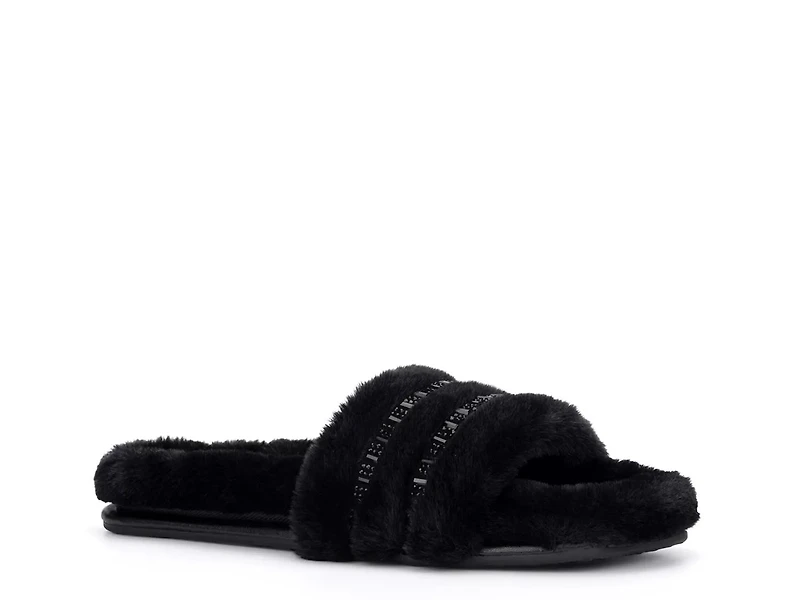 Are you someone who prioritizes all day comfort? Then pick the Claudia slide sandal by TORGEIS. Crafted using super-cozy faux fur, this sandal is highlighted with striped rhinestone accents that add an eccentric look. Coordinating lining and rubber sole complete the look.