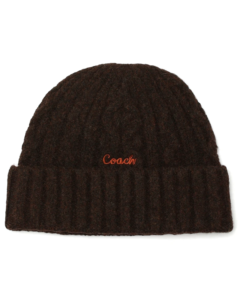 Showcasing a timeless cable knit pattern, this Coach beanie is highlighted with subtle embroidery for added charm. Soft, warm, and stylish, it makes a cozy accessory for cold-weather days.