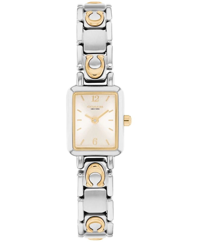 Classically elegant with a modern design, Mara is a refined tank watch perfect for day and night. Featuring the iconic sculpted Coach Signature on the slender bracelet, this two-tone stainless steel and gold tone watch has a chalk sunray dial detailed with a mix of numerical and stately stick markers. Sku 14504673