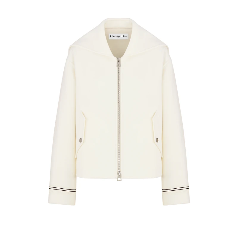 The coat redefines House codes of elegance. Crafted in ecru double-sided virgin wool-angora-blend felt, it features a regular-fit silhouette enhanced by black passementerie. Completed by slit pockets, the sophisticated coat will elevate any attire with a refined touch. Embroidered hallmark bee and CD signature. Front button closure. Black Christian Dior Paris horn buttons. Black passementerie detail. Tonal lining. 82% virgin wool, 15% angora, 2% polyamide, 1% elastane. Made in Italy