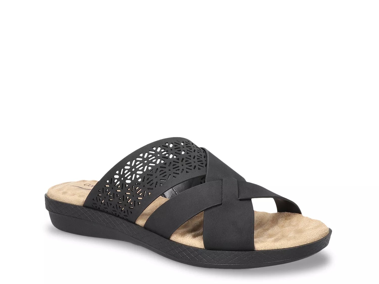 The Coho wedge sandal by Easy Street can keep you looking trendy while delivering impressive comfort. Interwoven straps and a perfed midfoot strap bring an edgy look to the slide sandal, made with a padded Comfort Wave footbed that keeps you cozy from heel to toe. A flexible unit bottom sole makes it easy to stroll.