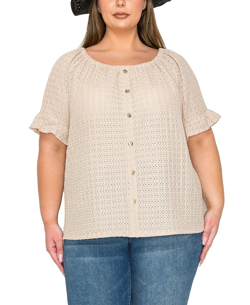Coin 1804 Plus Size Eyelet Jersey Button Front Ruffle Sleeve Peasant Top