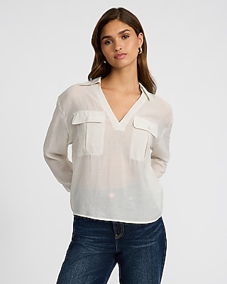 A classy top featuring a collared v neckline and double front pockets with a slightly sheer material.