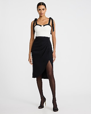 A timeless sheath shape pairs with a modern color block design and tie straps. This midi dress features a sweetheart neckline with seamed cup details and a draped skirt for the most flattering, chic look.