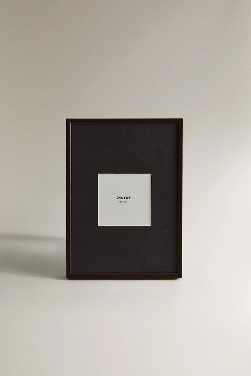 Photo frame with a colored metal edge and a matching mat for an 8 x 8 cm photo. It can be hung on the wall using the attachments at the back.