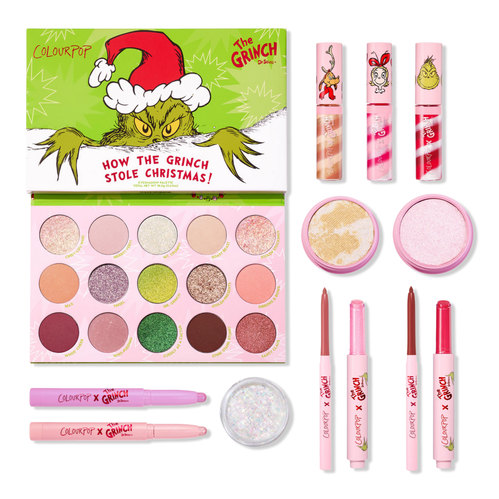 GRINCH FULL COLLECTION. Includes: How The Grinch Stole Christmas Eyeshadow Palette. Merry Grinchmas Swirl Lip Gloss Kit. Change of Heart Super Shock Highlighter Kit. Pinky Who So Juicy Plumping Gloss Balm & Lip Liner Kit. Berry Grinchy So Juicy Plumping Gloss Balm & Lip Liner Kit. Liked Christmas a Lot Shadow Stix Kit. Glitterally Obsessed Body Glitter Gel in Who-Hash. Benefits: Limited edition. :