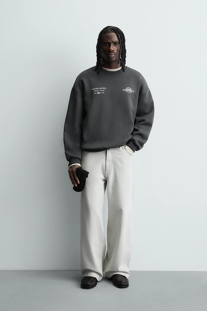 Relaxed fit sweatshirt made of a cotton blend fabric. Round neck and long sleeves. Contrasting combined prints on the front and back. Ribbed trim.