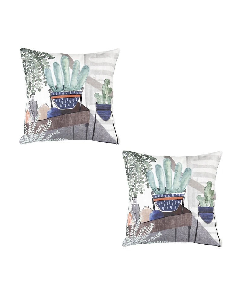 Add a cool touch of nature to your home with this stylish Cotton Cactus Pillow. This set includes two pillows. Each pillow features a cool-toned potted cactus design. The green and blue hues are sure to bring a serene feel to your home. Place a pillow on each end of your couch and enjoy the new aesthetic they bring.