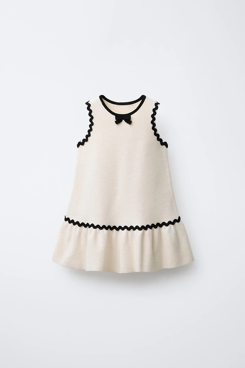 Knit dress with round neck and armhole sleeves. Wavy applique on armhole and hem.
