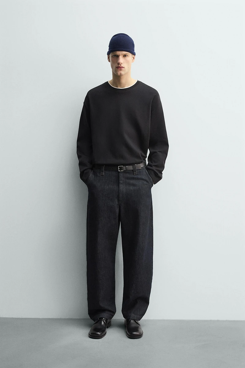 Relaxed fit T-shirt. Round neck and long sleeves. Double effect contrasting ribbed trims.